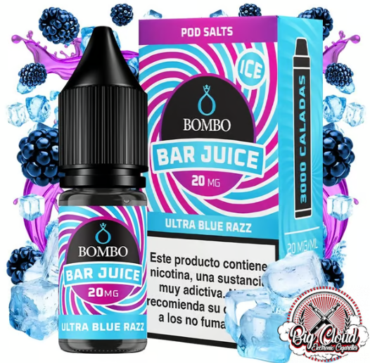 El líquido Ultra Blue Razz Ice de Bar Juice Nic Salts by Bombo sabe a frambuesas azules combinadas con un sutil toque cítrico y frío. Un deliciosa receta en la que Bombo ha logrado una intensidad sin precedentes.