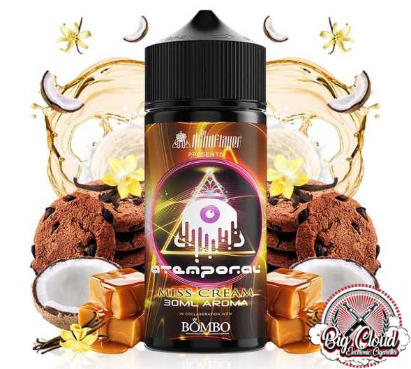 El aroma Atemporal Miss Cream de The Mind Flayer & Bombo en formato Longfill, es una increíble experiencia gracias a una deliciosa y dulce crema de vainilla al que añadimos galletas rellenas de caramelochocolate y un toque de coco para redondear esta receta.