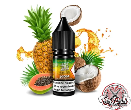 El líquido Papaya, Pineapple & Coconut de Just Juice de la gama Exotic Fruits es una fusión tropical de frutas jugosas con cada inhalación. La exquisita papaya te sorprenderá con su dulzura tropical, mientras que la piña aportará su toque cítrico y refrescante. Además, el coco cremoso añadirá una nota suave y exótica que completará esta experiencia frutal única.