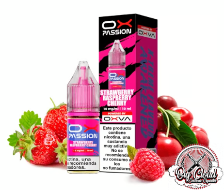 El líquido Strawberry Raspberry Cherry de Ox Passion by Oxva es la combinación de fresas y frambuesas maduras que aportan untoque jugoso e intenso, mientras que el sabor a cereza realza cada matiz con su dulzura característica, todo ello coronado con un toque burbujeante.