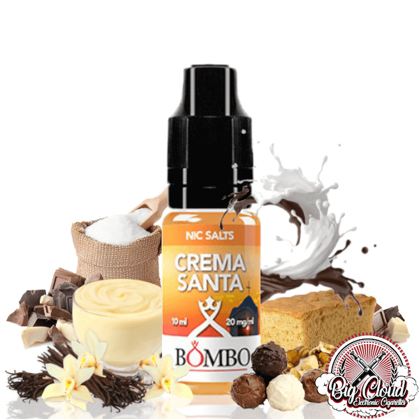 El líquido Crema Santa dela gama Bombo Nic Salts propone una exquisita base de bizcocho y crema pastelera con chocolate blanco y negro, vainilla y virutas de los mejores frutos secos, adornado con azúcar de coco. Todo una delicia.